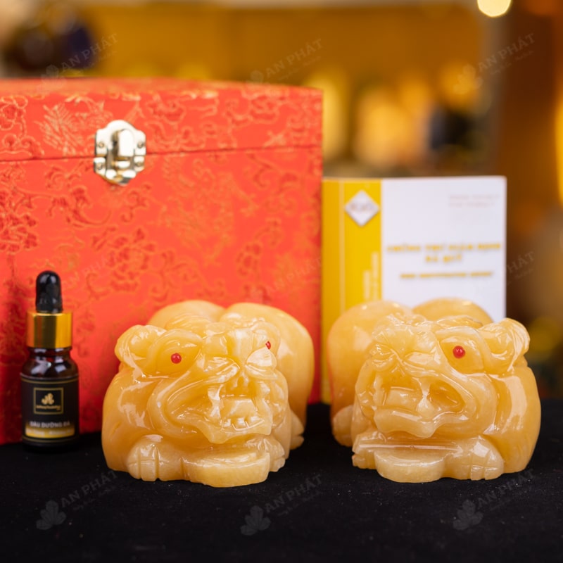 - Trọn bộ sản phẩm bao gồm: tỳ hưu + hộp đựng sang trọng + túi giấy sang trọng + dầu dưỡng đá + thiệp + giấy kiểm định chất lượng đá + khăm thơm bao sái + giấy hưỡng dẫn trực tiếp an vị + khai quang tại chùa Tứ Kỳ