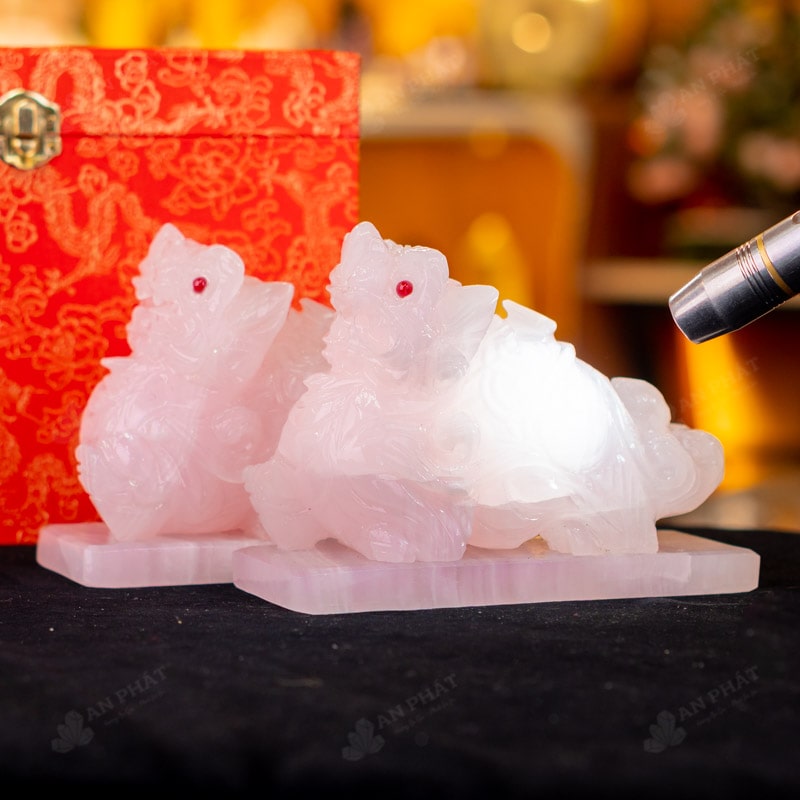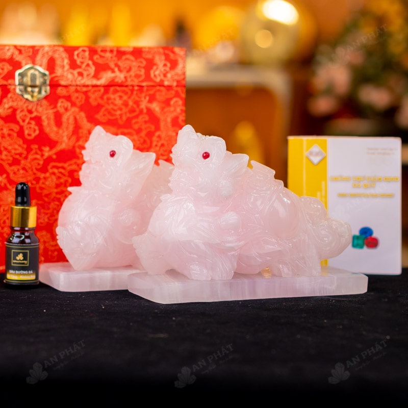 - Trọn bộ sản phẩm bao gồm: Cặp tỳ hưu + dầu dưỡng đá + thiệp + giấy kiểm định chất lượng đá + khăn thơm bao sái + giấy hướng dẫn trực tiếp an vị + khai quang tại chùa Tứ Kỳ