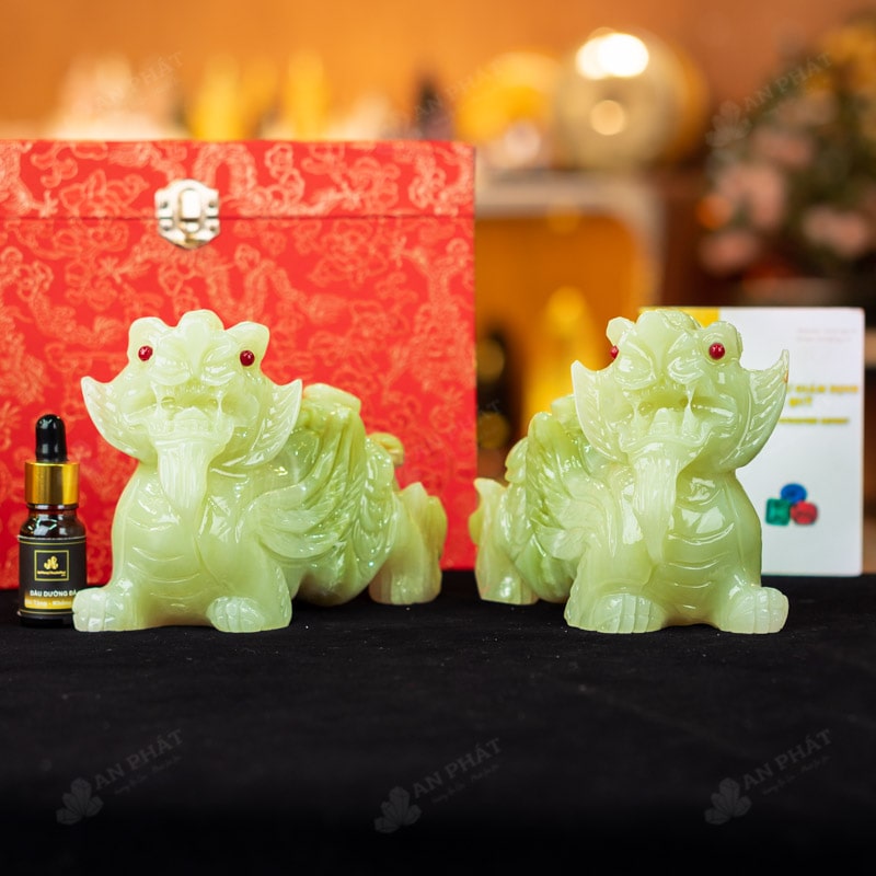 - Trọn bộ sản phẩm bao gồm: Cặp tỳ hưu + dầu dưỡng đá + thiệp + giấy kiểm định chất lượng đá + khăn thơm bao sái + giấy hướng dẫn trực tiếp an vị + khai quang tại chùa Tứ Kỳ