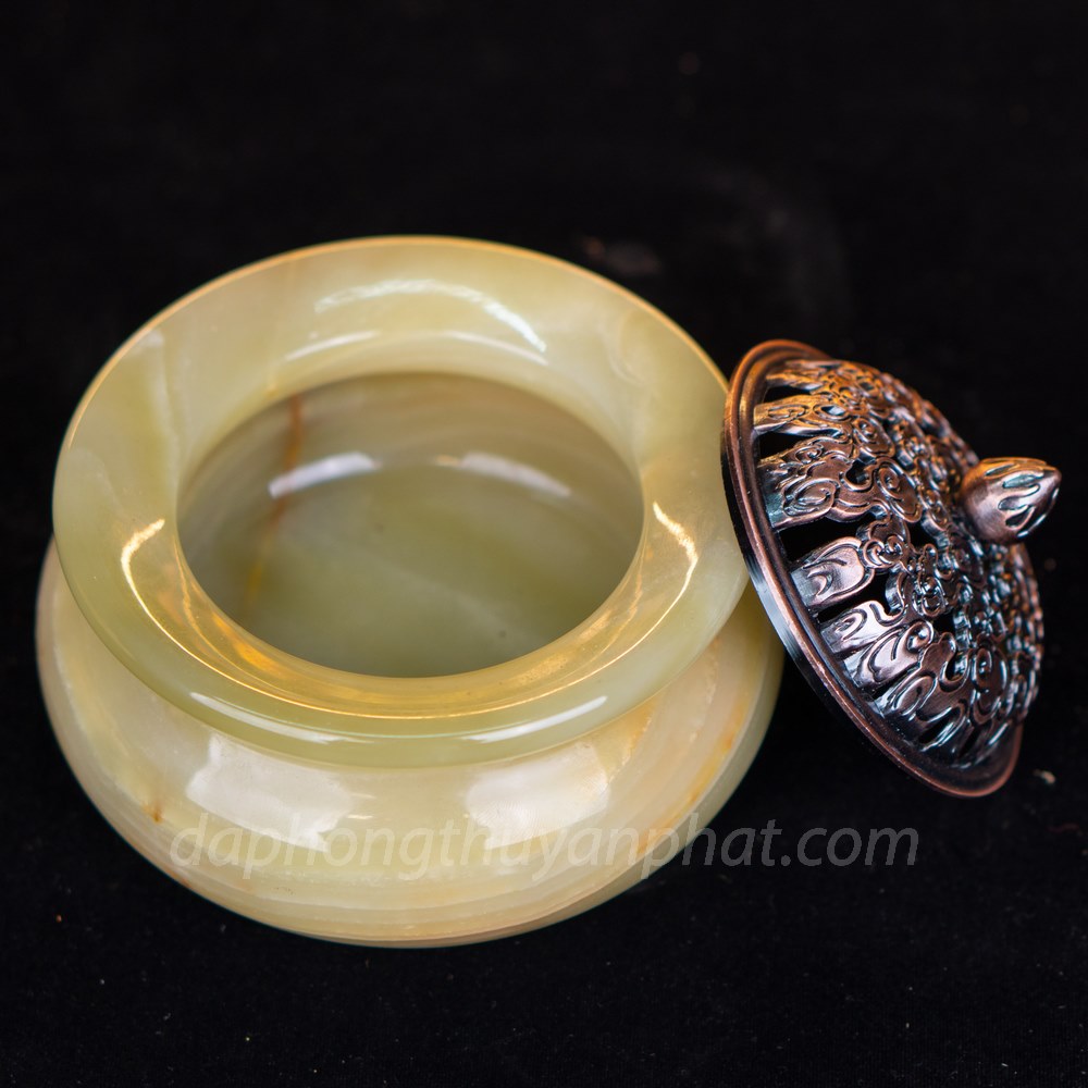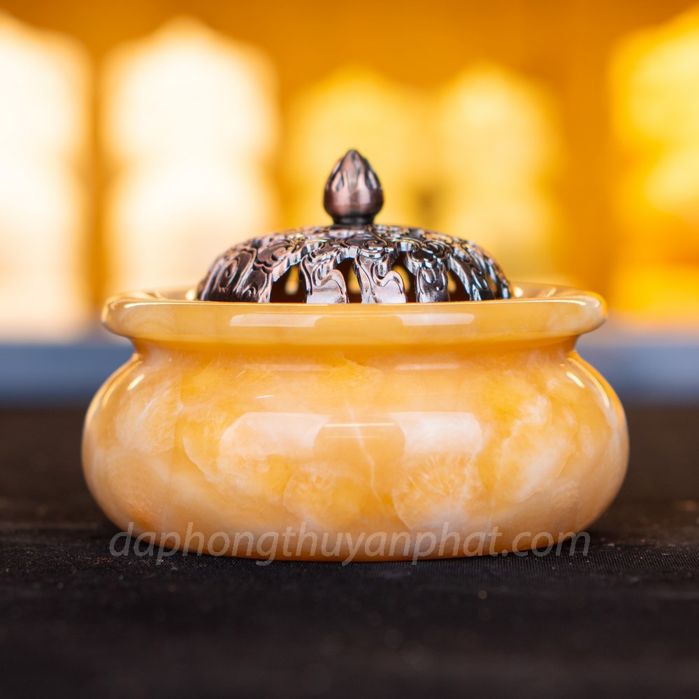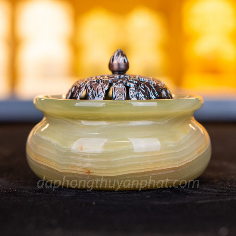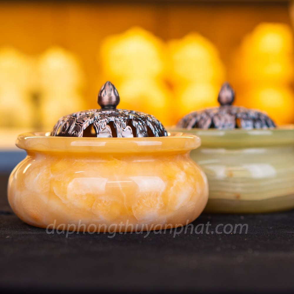 Xông trần là một vật phẩm từ xa xưa đã được sử dụng để trừ tà, tỏa mùi thơm trong nhà tạo cảm giác thư thái và dễ chịu. Xông trầm được chế tác từ đá onyx xanh và đá hoàng long vàng đem đến giá trị thẩm mỹ cao. Đồng thời đây là loại đá quý hiếm có tác dụng xua đuổi tà ma và những điều không hay. Mang đến cuộc sống may mắn và bình an cho tất cả mọi người xung quanh.